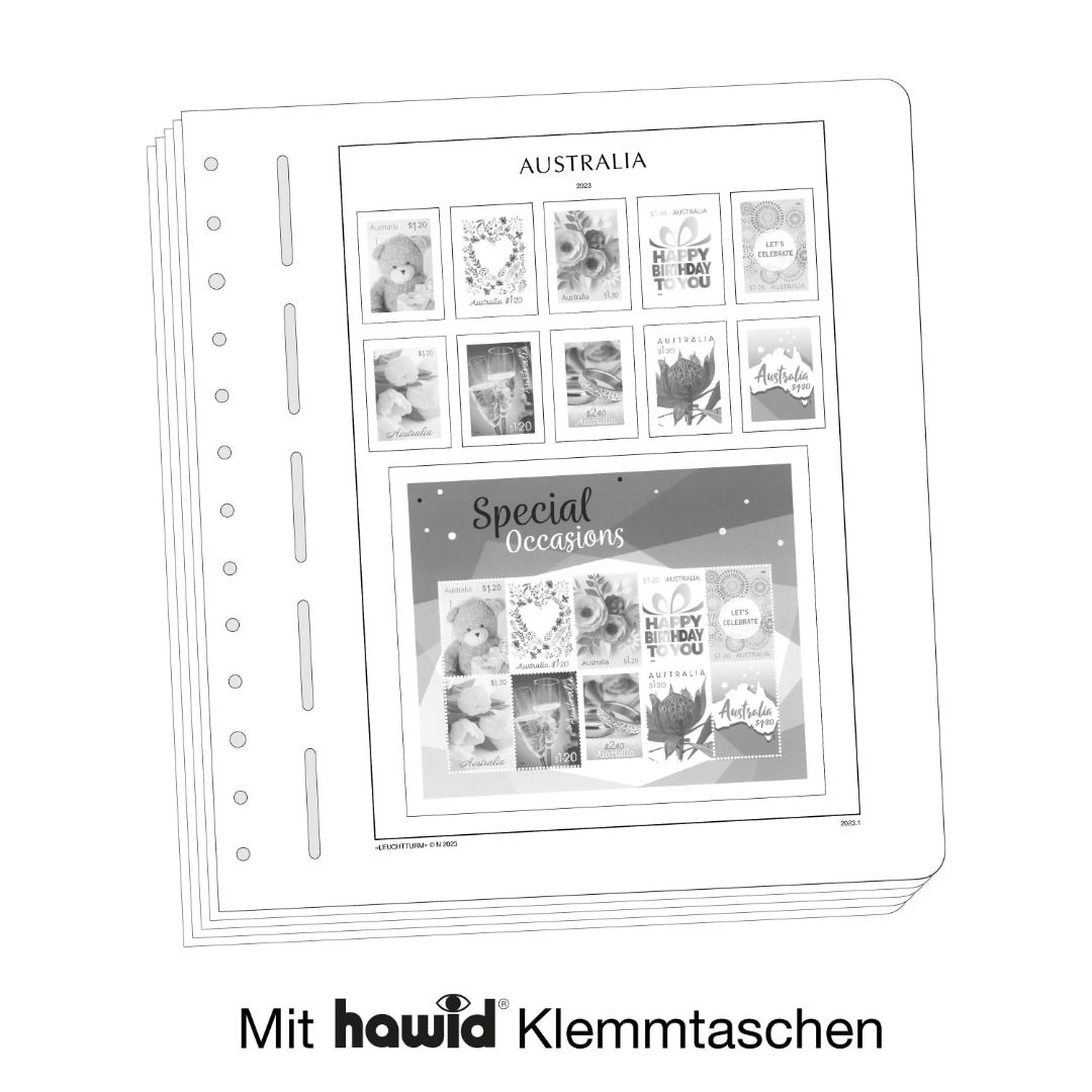 Die Albenblätter (13-Loch-System) werden im detailgetreuen schwarz–weiß Offsetdruck auf alterungsbeständigem, holz- und säurefreiem Karton (170 g/m 2 ) gedruckt. Leuchtturm verzichtet bewusst auf einen Farbdruck. Dies dient als Orientierungshilfe, damit Sie auf einen Blick sehen, welche Marken Ihnen noch fehlen. In der Größe des Markenvordrucks sind SF-Schutztaschen aus weichmacherfreier, glasklarer, entspiegelter Polystyrol-Folie auf den Albenkarton geklebt. Die Schutztaschen halten die Briefmarken präzise an ihrem Platz und verhindern ein Festkleben. Gleichzeitig bieten sie auch einen optimalen Schutz gegen Staub und Beschädigungen.
