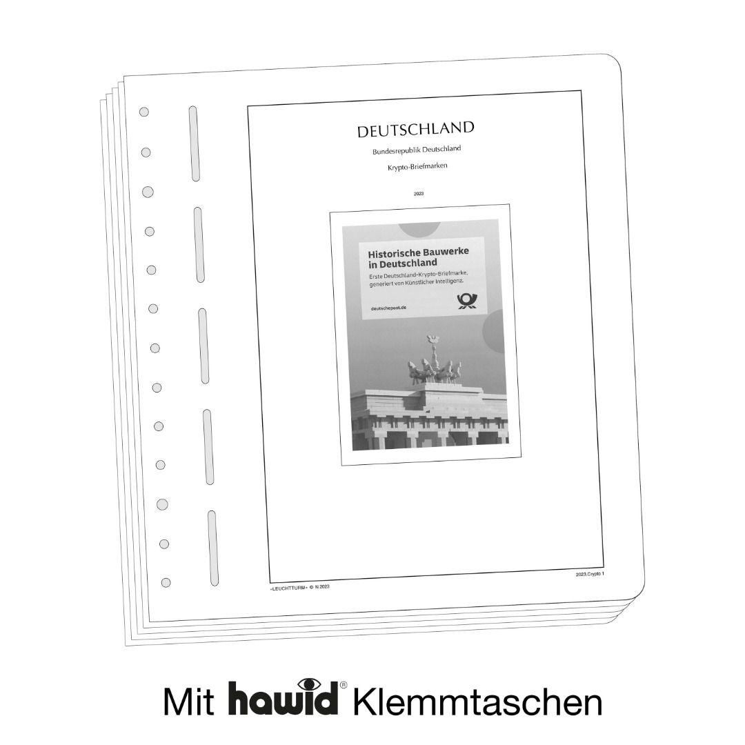 Die Albenblätter (13-Loch-System) werden im detailgetreuen schwarz–weiß Offsetdruck auf alterungsbeständigem, holz- und säurefreiem Karton (170 g/m 2 ) gedruckt. Leuchtturm verzichtet bewusst auf einen Farbdruck. Dies dient als Orientierungshilfe, damit Sie auf einen Blick sehen, welche Marken Ihnen noch fehlen. In der Größe des Markenvordrucks sind SF-Schutztaschen aus weichmacherfreier, glasklarer, entspiegelter Polystyrol-Folie auf den Albenkarton geklebt. Die Schutztaschen halten die Briefmarken präzise an ihrem Platz und verhindern ein Festkleben. Gleichzeitig bieten sie auch einen optimalen Schutz gegen Staub und Beschädigungen.
