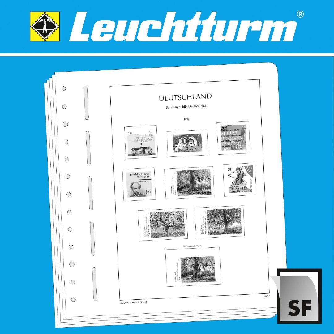 Die Albenblätter (13-Loch-System) werden im detailgetreuen schwarz–weiß Offsetdruck auf alterungsbeständigem, holz- und säurefreiem Karton (170 g/m 2 ) gedruckt. Leuchtturm verzichtet bewusst auf einen Farbdruck. Dies dient als Orientierungshilfe, damit Sie auf einen Blick sehen, welche Marken Ihnen noch fehlen. In der Größe des Markenvordrucks sind SF-Schutztaschen aus weichmacherfreier, glasklarer, entspiegelter Polystyrol-Folie auf den Albenkarton geklebt. Die Schutztaschen halten die Briefmarken präzise an ihrem Platz und verhindern ein Festkleben. Gleichzeitig bieten sie auch einen optimalen Schutz gegen Staub und Beschädigungen.