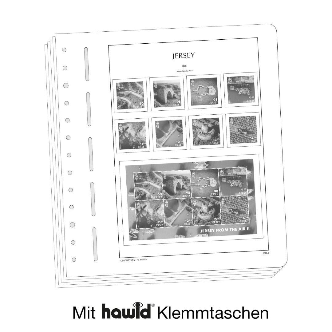 Die Albenblätter (13-Loch-System) werden im detailgetreuen schwarz–weiß Offsetdruck auf alterungsbeständigem, holz- und säurefreiem Karton (170 g/m 2 ) gedruckt. Leuchtturm verzichtet bewusst auf einen Farbdruck. Dies dient als Orientierungshilfe, damit Sie auf einen Blick sehen, welche Marken Ihnen noch fehlen. In der Größe des Markenvordrucks sind SF-Schutztaschen aus weichmacherfreier, glasklarer, entspiegelter Polystyrol-Folie auf den Albenkarton geklebt. Die Schutztaschen halten die Briefmarken präzise an ihrem Platz und verhindern ein Festkleben. Gleichzeitig bieten sie auch einen optimalen Schutz gegen Staub und Beschädigungen.
