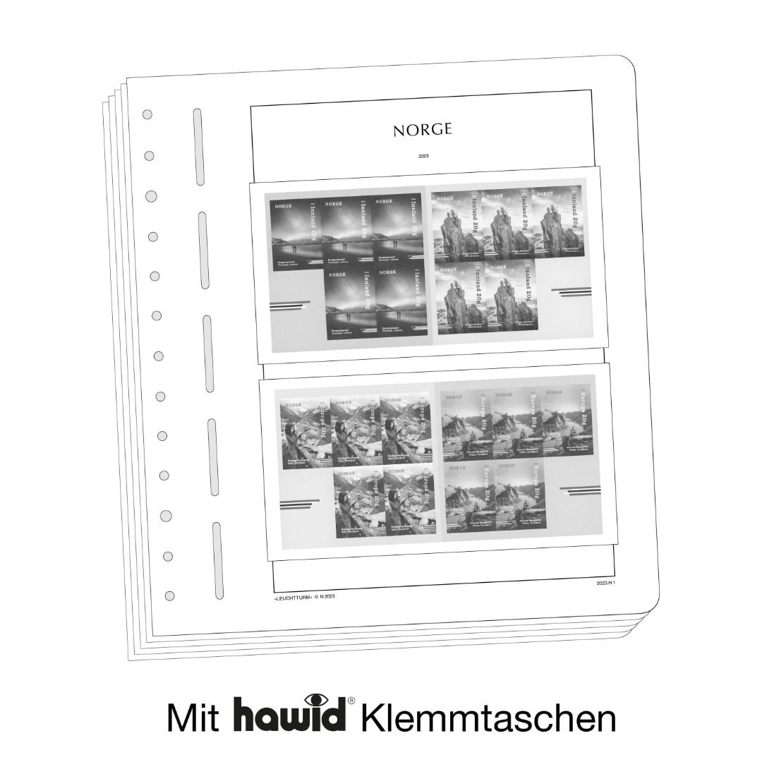 Die Albenblätter (13-Loch-System) werden im detailgetreuen schwarz–weiß Offsetdruck auf alterungsbeständigem, holz- und säurefreiem Karton (170 g/m 2 ) gedruckt. Leuchtturm verzichtet bewusst auf einen Farbdruck. Dies dient als Orientierungshilfe, damit Sie auf einen Blick sehen, welche Marken Ihnen noch fehlen. In der Größe des Markenvordrucks sind SF-Schutztaschen aus weichmacherfreier, glasklarer, entspiegelter Polystyrol-Folie auf den Albenkarton geklebt. Die Schutztaschen halten die Briefmarken präzise an ihrem Platz und verhindern ein Festkleben. Gleichzeitig bieten sie auch einen optimalen Schutz gegen Staub und Beschädigungen.